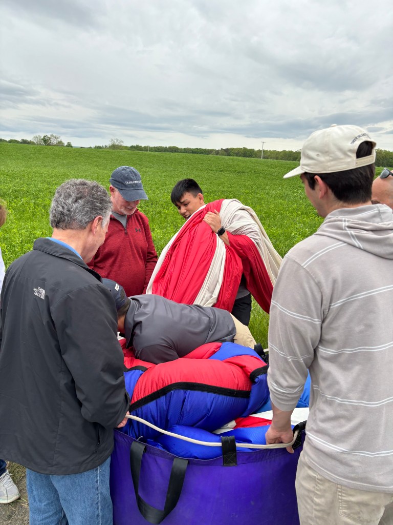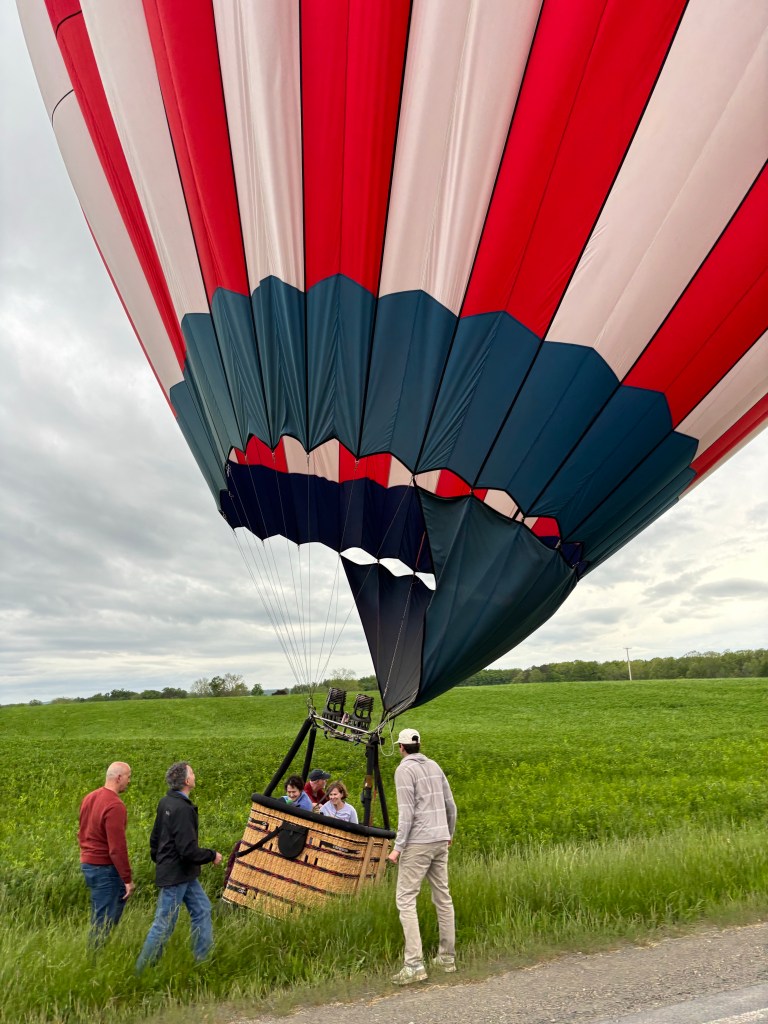 I think we were all a bit nervous about the landing. Once he found a good spot, Dar had the heavier people, including my very strong husband, move to one side of the basket. We all crouched down with all body parts inside the basket. We dragged on the ground for a bit. My husband got out and helped hold us down, which he said was hard. (He got a rather large bruise as we attempted to “jump” the basket up and over a small ditch. Inside the basket, we actually jumped up and down.)