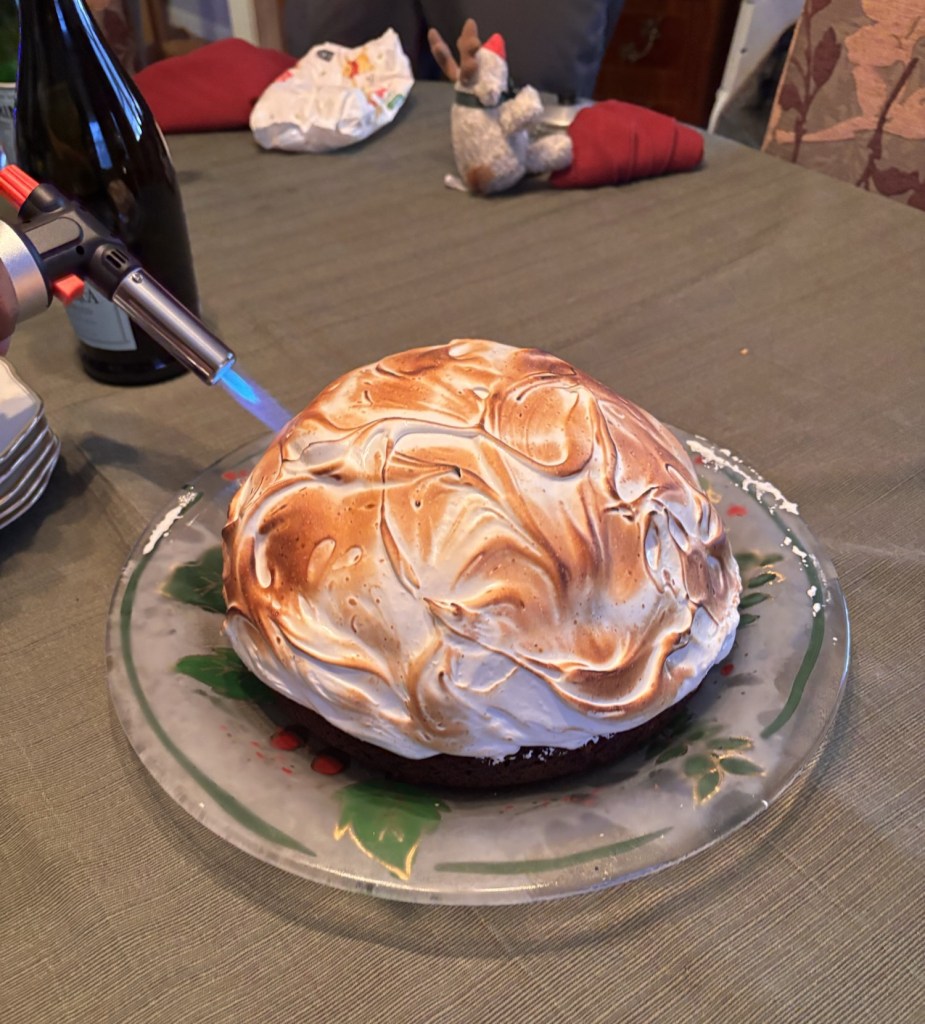 I wanted to make a special dessert for Christmas dinner so I decided to try a “Baked Alaska” which is something I’ve always wanted to do. It was a Bucket List dessert for me. I wasn’t even clear on exactly what’s in it, but I had a vague memory that it is delicious and special and involves flames. I think our next door neighbor growing up (Carolyn) made Baked Alaska for her big annual Christmas Eve parties. If my memory is right, Carolyn covered hers with actual flaming liquor as the final step. The internet has many examples of that step going horribly wrong, so I chose to follow my favorite baking website’s version of the recipe, which doesn’t include lighting alcohol on fire, but did urge me to purchase a kitchen torch so we could still experience some drama.