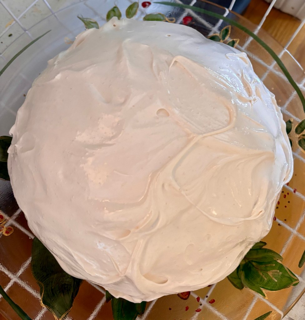 The disastrous part was that I hadn’t yet made the meringue. Have you ever tried to make meringue with ONLY a hand whisk? It took my husband and me one full hour of whisking to get the eggs, sugar and cream of tartar to turn into “glossy meringue with stiff peaks” as directed. In the end, we prevailed, but I was really worried that our shoulders were going to be sore the next day on Christmas. (We were OK.) I was able to completely cover the ice cream dome with my stiff-enough meringue and popped the whole thing in the freezer for the next day.