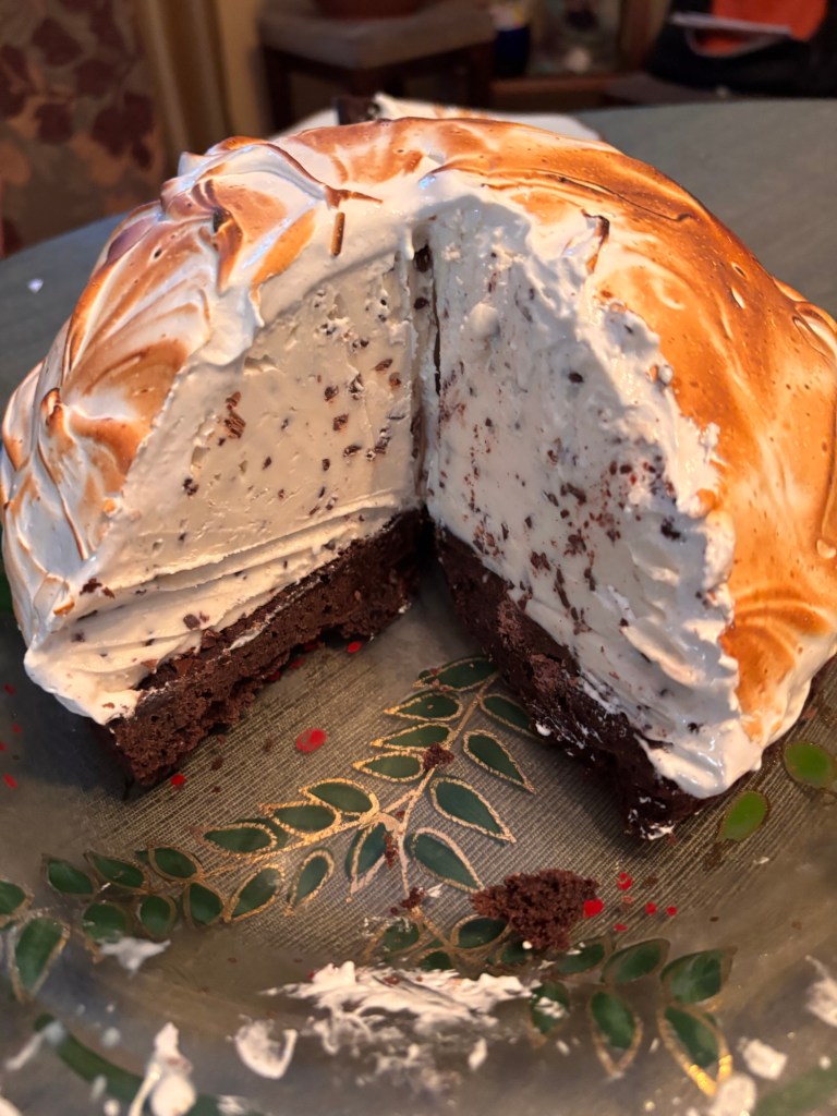 Sally’s Baked Alaska Recipe is a brownie base, with two 1.5 quart containers of any flavor ice cream (I used mint chip), covered with a toasted meringue dome. According to her recipe, if you don’t have a kitchen torch, you can bake the whole thing (ice cream and all) in a hot oven for a few minutes to toast the meringue.