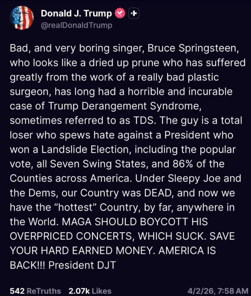 This isn’t funny, it’s scary April 3, 2026April 3, 2026 ~ MaryG It’s scary to have a deranged person as President of the United States. Share this: Share on X (Opens in new window) X Share on Facebook (Opens in new window) Facebook Like Loading...