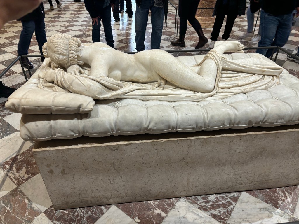 I do have a museum story for you. When we were visiting the Greek Antiquities section in the Louvre in December, I saw a group of French school children (around age 8) gathered around a sculpture, listening intently to their teacher. From where I was standing, I could only see the back of the sculpture — a reclining woman.