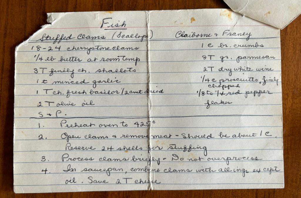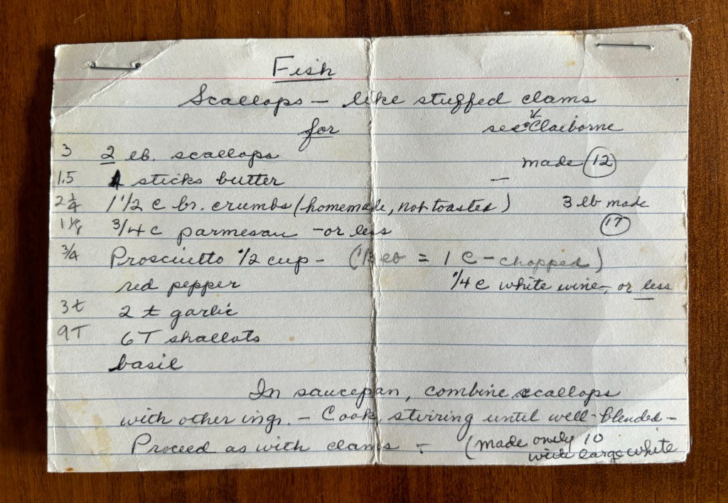 Page 2 of the recipe card, which references (I think) Claiborne & Franey’s 1983 recipe for stuffed clams, which she adapted for scallops