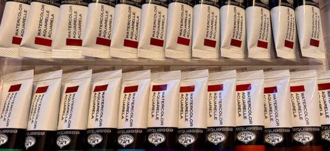 I started my 5-week class at a very nearby community arts center yesterday. I don’t like the set-up as much as the fancier arts center where I took my first watercolors class in the fall. The room is nice and sunny, but it’s quite crowded and no sinks. You have to use the restroom in the hall to get water and rinse your brushes.