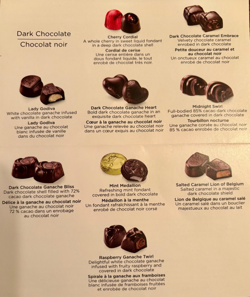 Here’s the box of chocolates I opened last night–a gift from my husband–which entitled him to one chocolate of his choice. I generously gave him first pick. He had a Midnight Swirl (“full-bodied 85% cacao dark chocolate ganache covered in dark chocolate”). I then had a Dark Chocolate Ganache Heart AND a Salted Caramel Lion of Belgium (amazing). Now I have fifteen fine Belgian dark chocolates left, but who’s counting?