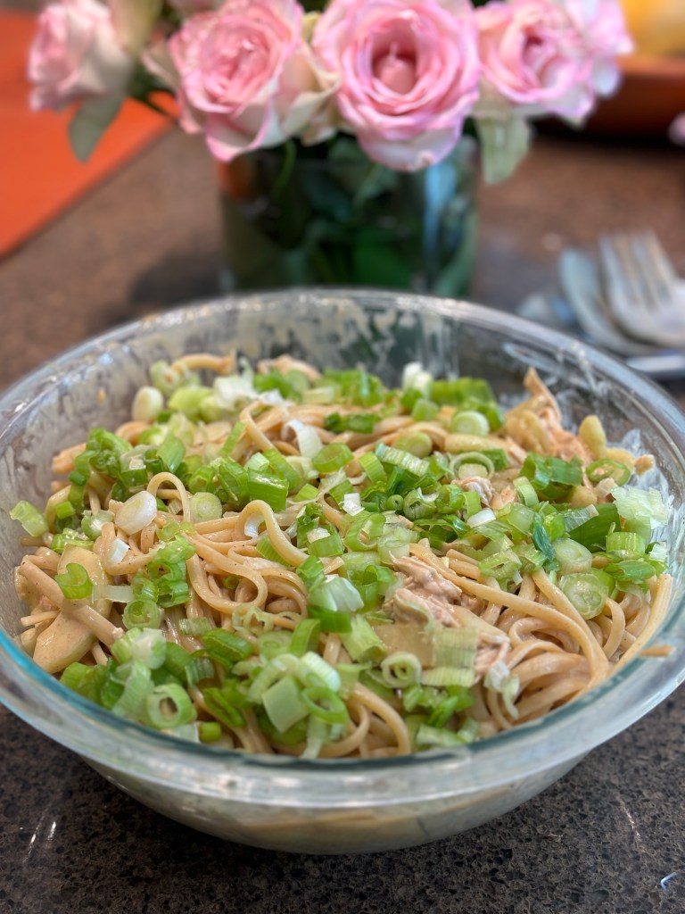 You don’t think of peanut butter and pasta as being a good combo, but this recipe from NYT Cooking is a winner. It’s called “Cold Noodles with Sesame Sauce, Chicken and Cucumbers.” I didn’t have sesame paste (tahini) so I substituted natural peanut butter (as the recipe suggests) and it was good! I will try it again with tahini at some point.